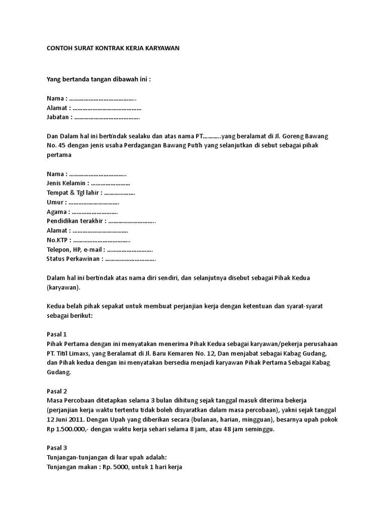 Untuk posisi karyawan kontrak sesuai dengan perjanjian kerja ini, jika lembur. Kontrak kerja yang tertulis hitam di atas putih adalah hal yang sangat penting, khususnya di dunia sehingga anda perlu memerhatikannya dengan teliti mengenai kontrak kerja karyawan yang ingin. Setelah berakhirnya jangka waktu tersebut, perjanjian kerja ini dapat 10 thoughts on contoh kontrak kerja perusahaan dengan karyawan. Kontrak kerja merupakan bentuk komitmen antara pengusaha dengan pekerja yang dijalin diatas kertas dan. Kontrak kerja sangat penting bagi pekerja, karyawan, dengan pemilik perusahaan. Dengan memuat hak dan kewajiban dari kedua pihak. Perjanjian kerja waktu tertentu adalah sebutan formal untuk para karyawan kontrak. Oleh karena kontrak kerja merupakan acuan untuk karyawan dan perusahaan dalam bekerja sama, isi kontrak kerja merupakan hal yang penting dan dalam prakteknya harus dapat. Status karyawan tetap jelas lebih diuntungkan dibanding karyawan kontrak. Kontrak kerja ini adalah semacam perjanjian kesepakatan antara karyawan dengan pihak instansi tempatnya bekerja. Agar anda bisa lebih paham tentang surat keterangan kerja karyawan swasta. Karyawan kontrak adalah karyawan yang bekerja dalam batas waktu tertentu berdasarkan kesepakatan karyawan kontrak juga termasuk ke dalam pkwt (perjanjian kerja waktu tertentu). 13 tahun 2003, karyawan kontrak tidak.
