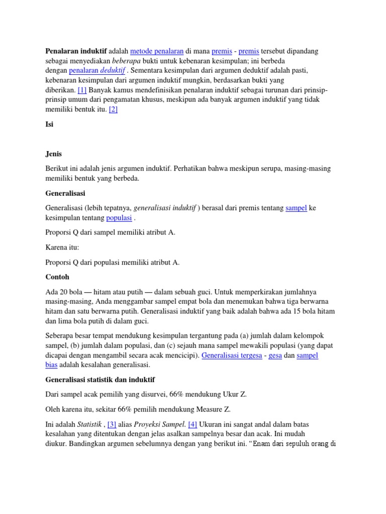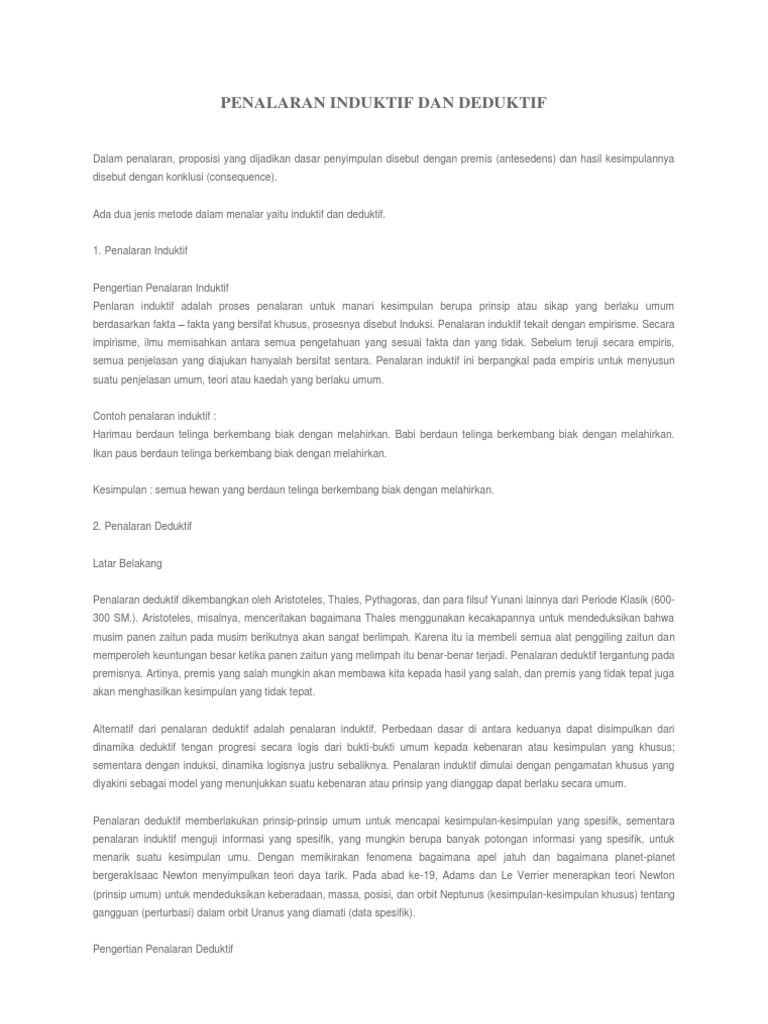 Tes penalaran induktif mengukur kemampuan untuk secara fleksibel menangani informasi yang tidak dikenal dan menemukan solusi. Orang yang nilainya baik dalam tes ini memiliki kemampuan besar untuk berpikir baik secara konseptual maupun analitikal. Oct.09, 2009 in bahasa indonesia 1 penalaran adalah proses berpikir yang bertolak dari pengamatan indera (observasi empirik) yang menghasilkan sejumlah konsep dan pengertian. Karakteristik, jenis, dan contoh penalaran induktif itu alasan induktif ini adalah jenis pemikiran yang mencoba untuk membuat teori umum berdasarkan pengamatan khusus. Generalisasi generalisasi adalah pernyataan yang berlaku umum untuk semua atau sebagian besar gejala yang diamati.